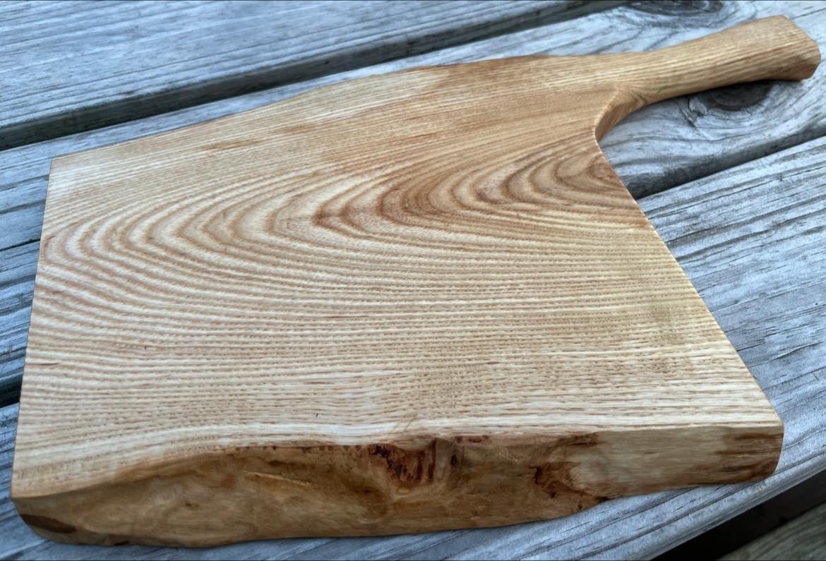 Live edge Ash wood cutting board.ย  ย 12″ diagonal not including handle.